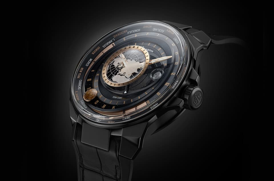 同系列尚有Blast月之狂想世界时区手表也会出现在这次的展览中,表款採用45mm的黑色陶瓷和黑色DLC钛金属表壳,搭配黑色鱷鱼皮表带,提前为砂金石面盘铺陈好能够聚焦视线的舞台。砂金石面盘总让人产生一种像是在仰望星空的美感,手表面盘有别于基本功能,可以一一显示世界时区、双时区、月相、潮汐以及太阳、月亮与地球相对位置等资讯。设计富有创意甚至诗意,但是阅读时又很简便不费力,这款表以地球为中心显示,传达地球所看到的太阳绕行运动和月球轨跡,而且众多功能竟然只要靠着单一的表冠就能设定,结构之精妙让人印象深刻。
