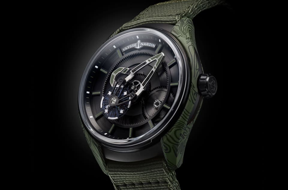 提到雅表表的高复杂作品,当然不能不提Freak奇想系列,这次将现身在「雅典表 高级复杂功能表展」的是Freak X OPS。手表的表壳、表圈和表冠皆採用黑色DLC钛金属制成,搭配表侧的卡其绿色碳纤维复合材质——品牌将碳纤维与绿色环氧树脂交叠构成,造就出表侧高辨识度的不规则纹路,第一眼印象就很强烈。至于手表面盘更是标榜双无设计,包括无面盘与无指针等,雅典表利用卡罗素装置一小时转一圈的周期使它兼作分针之用,同时机芯本身一小时自转一圈的特性也能搭配指标指示小时,虽然手表搭载的机芯结构很复杂,可是显时的效果一目了然,品牌的周到设计思维由此可见一斑。
