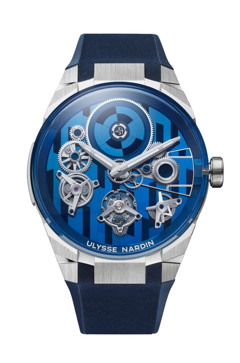 本次的「雅典表 高级复杂功能表展」展品以三款平常罕见的大作倍受瞩目,首先是Blast自由之轮陀飞轮硅质细工镶嵌手表,表款将UN-176自制机芯的构造直接呈现在面盘侧,包括传动轮系、配备雅典锚式恆定摆动擒纵装置的陀飞轮、发条盒和7日动力储存显示等等都能看得一清二楚,这些组件与下方盘面的机芯结构以隐祕的方式巧妙相连,一眼看上去那些机芯组件好像悬浮于美轮美奐的硅质细工镶嵌马赛克图案上,艺高人胆大赋予手表视觉饗宴。