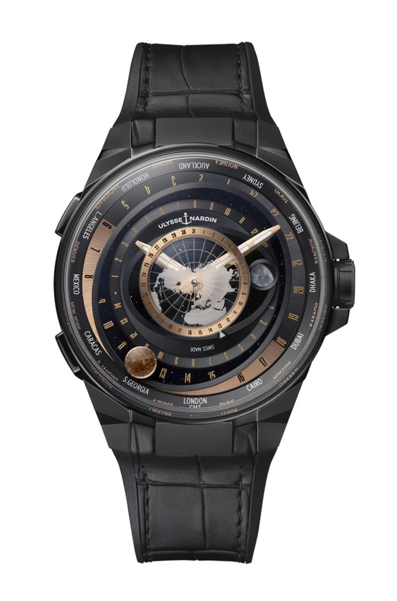 DLC钛金属、陶瓷材质/UN-106自动上链机芯/时、分、日期/世界时区显示/两地时间显示/月相显示/潮汐系数显示/太阳、月亮与地球相对位置显示/蓝宝石水晶镜面、透明底盖/防水30米/表径45mm/参考价:NT$ 2,643,000