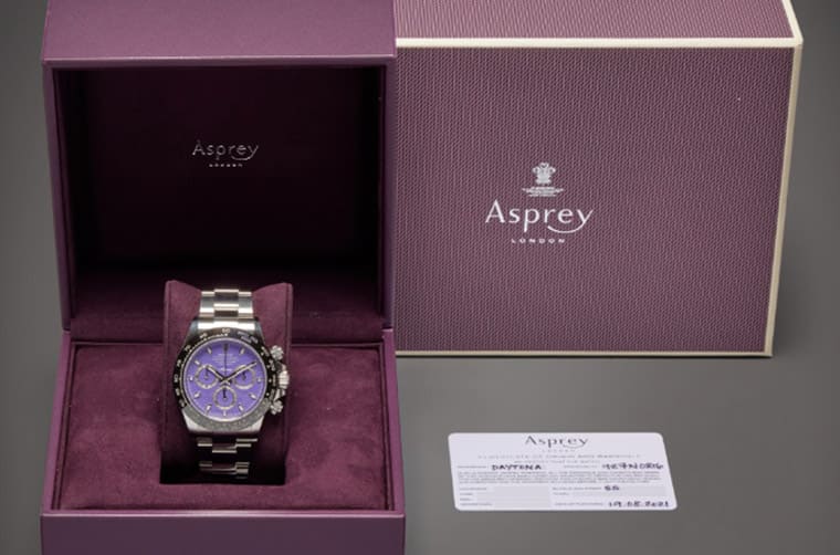 Asprey与劳力士早在1970年代就已经连上线,当时因为多国元首常透过Asprey入手一些高级名表,所以劳力士也会在Asprey的帮忙下,向阿曼政府高层销售特殊订制手表——还记得那些印有阿曼皇族徽饰”Khanjar”匕首图腾的特殊劳力士在市场上有多夯吧,总之Asprey与劳力士合作之后,前者也会用代表他们Logo的紫色系订制独卖的劳力士手表,这就是苏富比线上拍卖那款紫面116500LN诞生的由来。