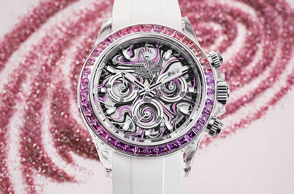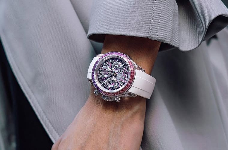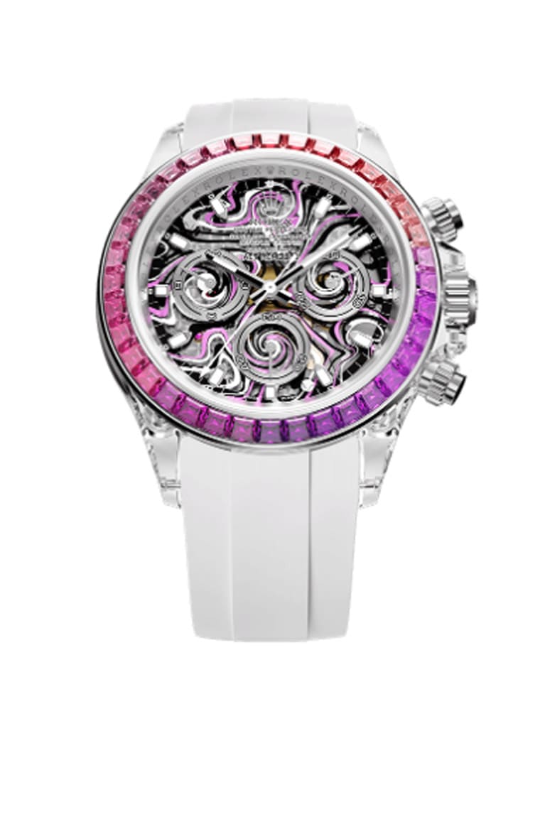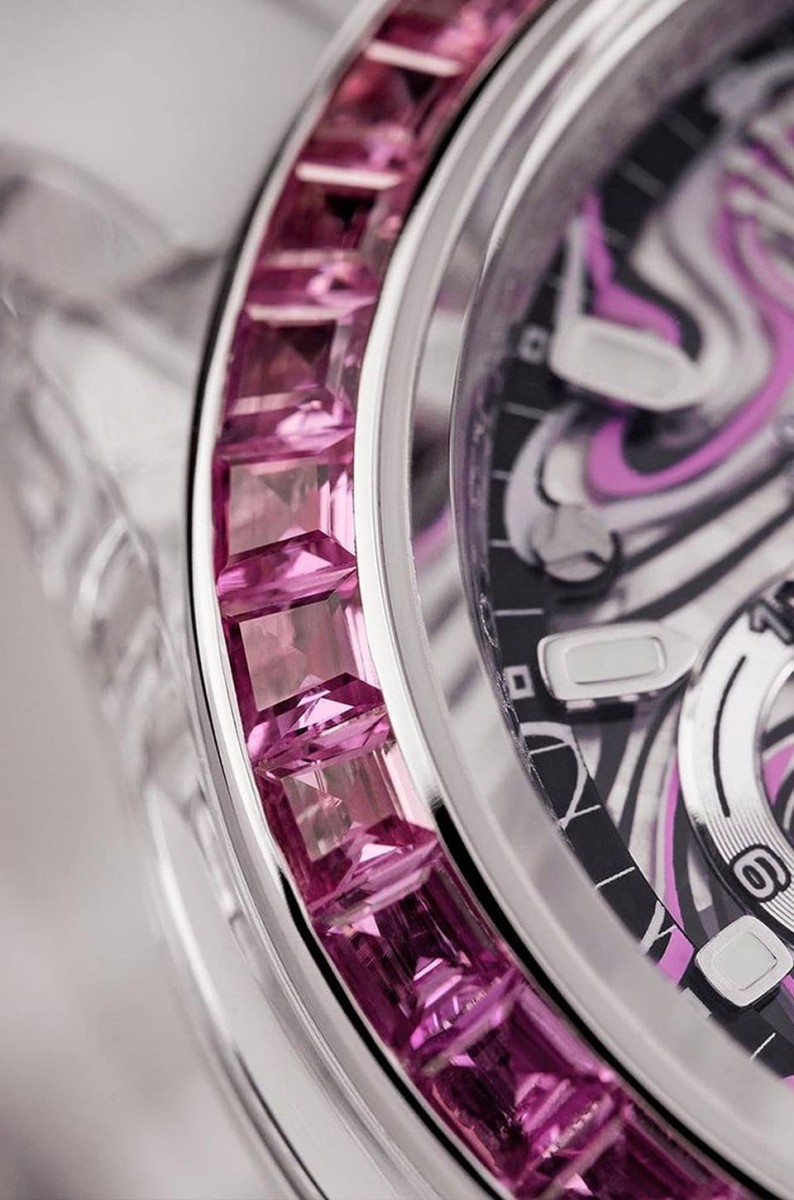 ▲Daytona ”Nebula”蓝宝石水晶面盘以黑、粉、白三色彩绘上流体图案,如同星云旋涡般的效果,赋予手表赏心悦目的美感。Source:AET REMOULD