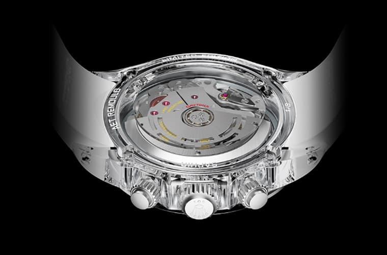 至于表背部分反而显得相对精简,AET REMOULD换上透明表壳后,与透明底盖更大范围地露出手表搭载的4130机芯,包括底盖以及机芯零件都没有再额外点缀更多修饰或图案,让表主可以保有纯粹欣赏机械结构的乐趣。