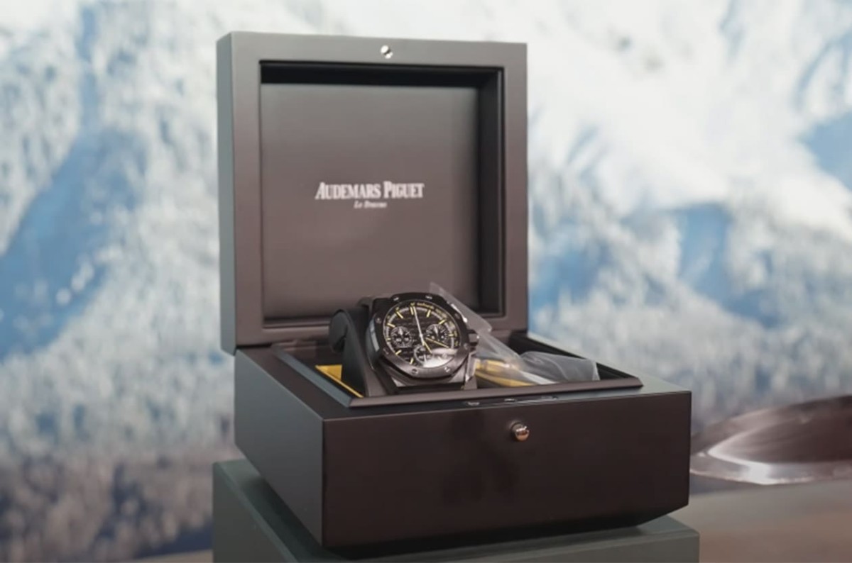 阿诺在飞往德国那时手上戴了一款爱彼AP的玫瑰金链带皇家橡树离岸型计时码表,但是行李中收藏着另一款同品牌的黑陶瓷Royal Oak Offshore皇家橡树离岸型计时码表(26420CE),海关人员有理由怀疑他是想带表跨国交易牟利,因此才会先扣住手表并拘留阿诺(虽然照常理想也知道阿诺不太需要靠私下转卖手表赚钱),那麼他为何还要多带一只盒单俱全的表在身上呢?原来他正是要带着表去史瓦辛格气候倡议组织的筹款晚宴,那只26420CE其实是晚宴的拍品之一,从阿诺要亲自护送手表到晚宴上,可见它的确很有意义,当然价值也不菲。