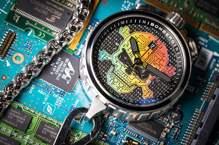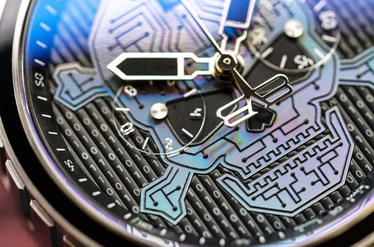 手表/怀表两用设计之于Bolt-68 Heritage这样的作品并不令人感到陌生,但是手表这次的造型设计就充满更多惊喜感了。黑色面盘上印有以0与1构成的电脑语言,其整齐排列远看像是电脑萤幕般呈现浓浓科技风格。至于在这个电脑语言背景上最抢眼的焦点莫过于骷髏头图案,其表面经过处理后呈现硅晶圆似的质感,随着光线与角度变化,骷髏头图案也会反射出丰富鲜艳的色彩;不止如此,炸弹表还在骷髏头图案加上灵感来自电路板的纹路线条,如此一来手表想要表达的科技感更为深刻——以骷髏头代表连结数位世界的硬体,而黑色背景与数字则犹如数位世界的软体,交织成极能呼应创作主题的视觉效果。