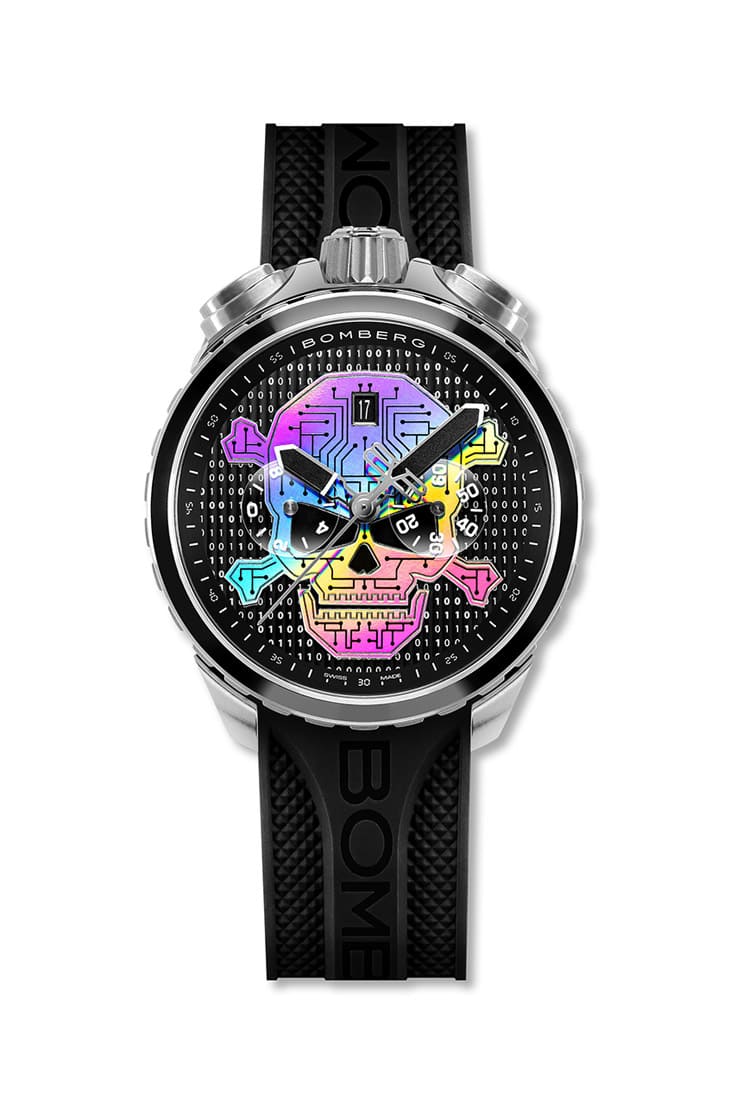 不锈钢材质/石英机芯/时、分显示/计时码表功能/蓝宝石水晶镜面/防水50米/表径45mm/限量150只/参考价:NT$ 53,800(随表附赠AY GüEY与BOMBERG联名数位骷髏潮T一件)