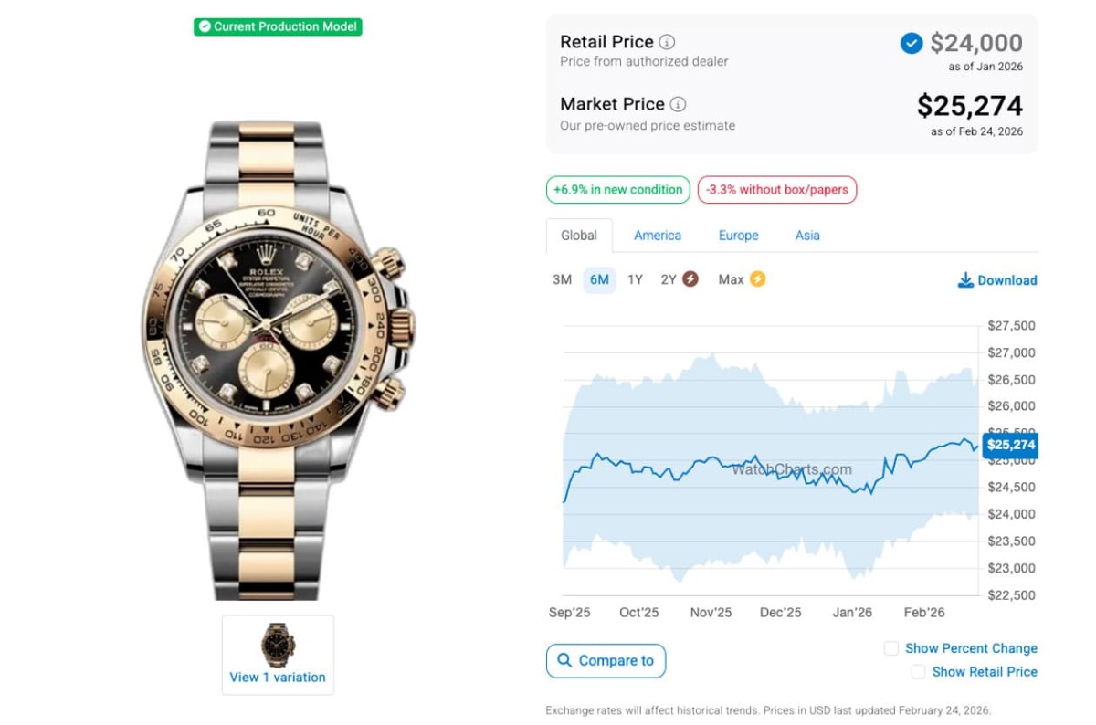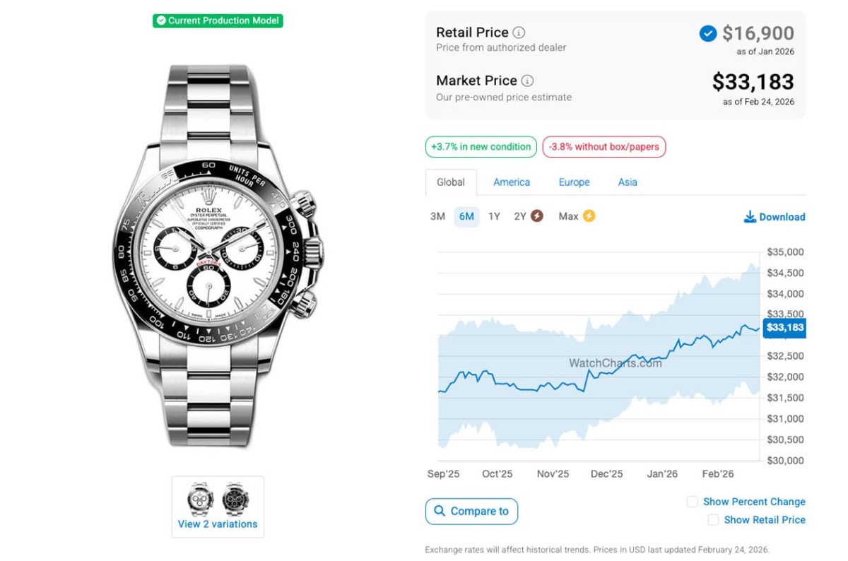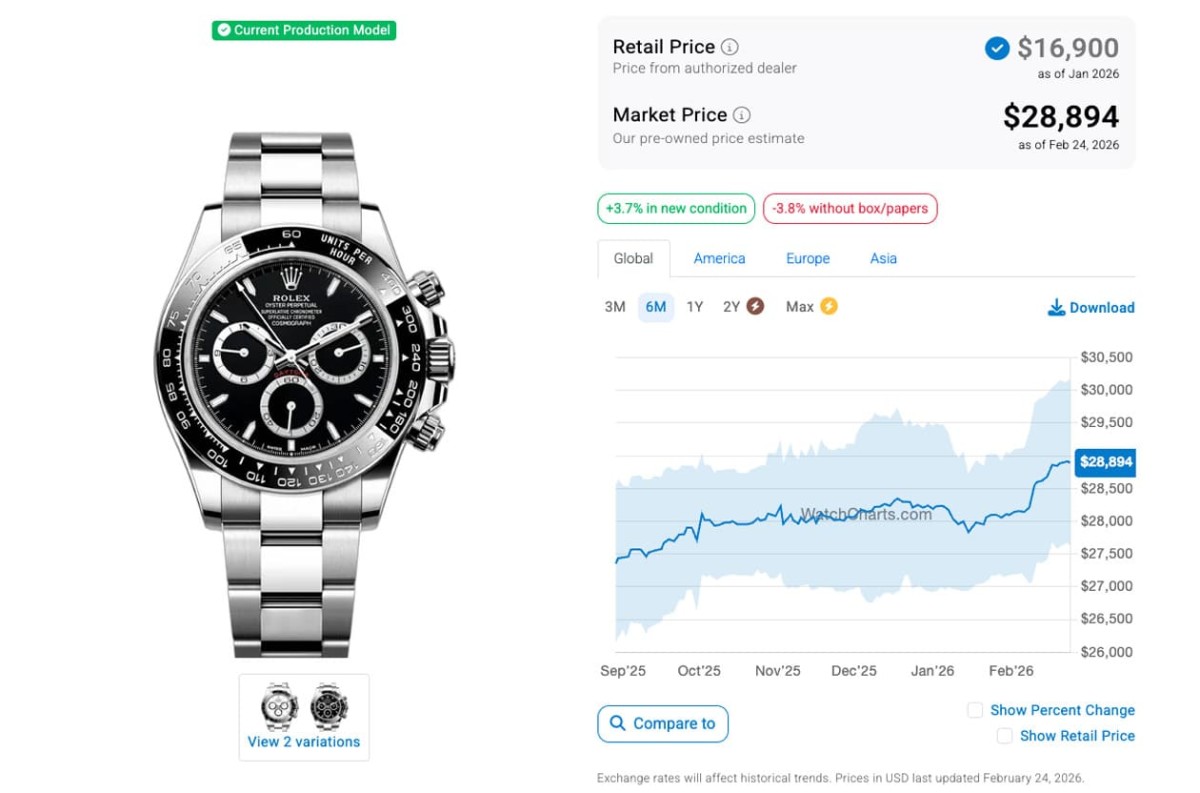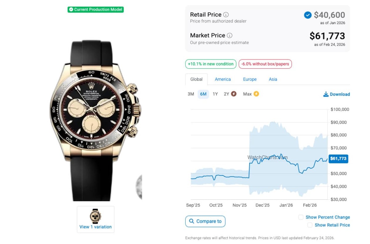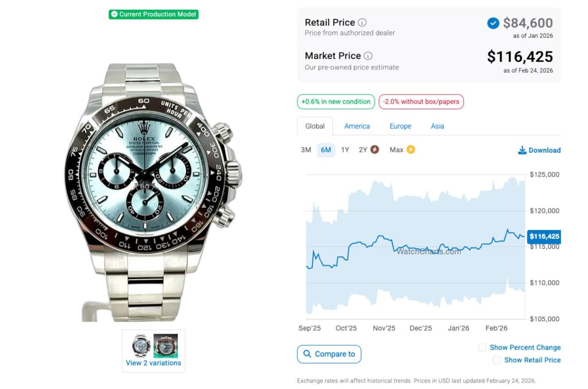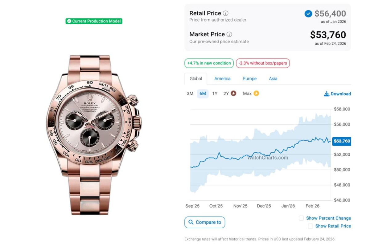 到了2026年2月底,当现行版Daytona进入二级市场的款式与数量愈来愈多,加上热门表行情下修的趋势似乎已到谷地反弹的地步,因此前述的六种型号身价起起伏伏后,比起半年前竟都有所成长。同样由WatchCharts的资料可见,目前Daytona各款最新报价分别是钢壳白面126500LN-0001:33,183美金(约合台币103万6)、钢壳黑面126500LN-0002:28,894美金(约合台币90万2)、半金时标镶钻款126503-0002:25,274美金(约合台币79万)、永恒玫瑰金款126505:53,760美金(约合台币168万)、黄金款126518LN:61,773美金(约合台币193万),以及铂金款126506:116,425美金(约合台币363万7)。之前受到美国对等关税政策、通膨疑虑等因素影响,以及黄金价格持续高升的情况下,导致贵金属表壳和半金表壳的Daytona去年的二级市场行情纷纷走高,但是到了12月以及跨完年后情势又有点变化,不管不锈钢或贵金属款式身价一个月前后都有所成长,,为今年写下漂亮开局,尤其黄金款126518LN经历1月的一波低潮后,马上在2月有所回应弹高,戏剧性发展让人看傻了眼。
