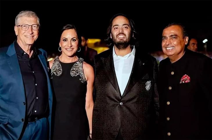 ▲亚洲首富Mukesh Ambani(右一)最近帮小儿子(右二)举办奢华婚前派对,邀请世界名人如比尔盖兹(左一)出席共襄盛举。Source:Euronews