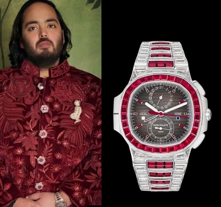 Anant Ambani在婚前派对上还秀出了更多很猛的梦幻手表,像是他戴了百达翡丽的Nautilus 5990/1422G,手表具备实用好用的两地时间功能,但是重点在于它的白金表壳上镶了满满的矩形切割钻石和红宝石,豪华程度远胜一般的金鹰5990,这款表的价值至少要250万美金。