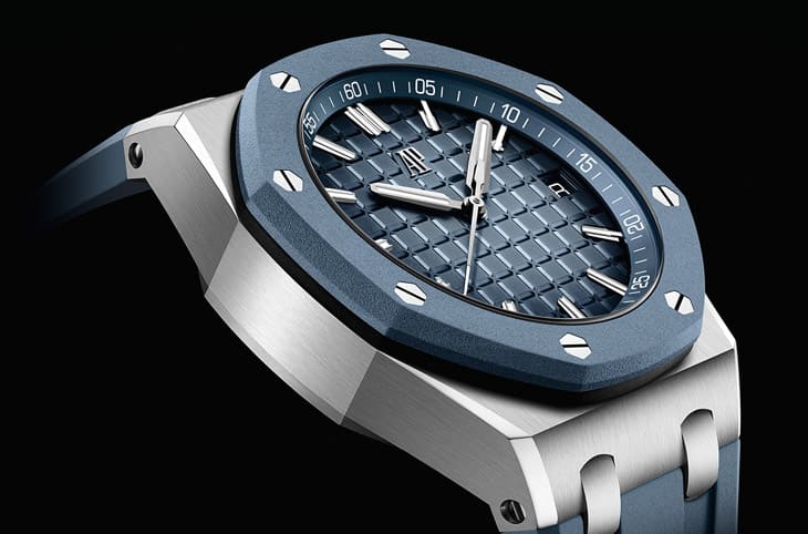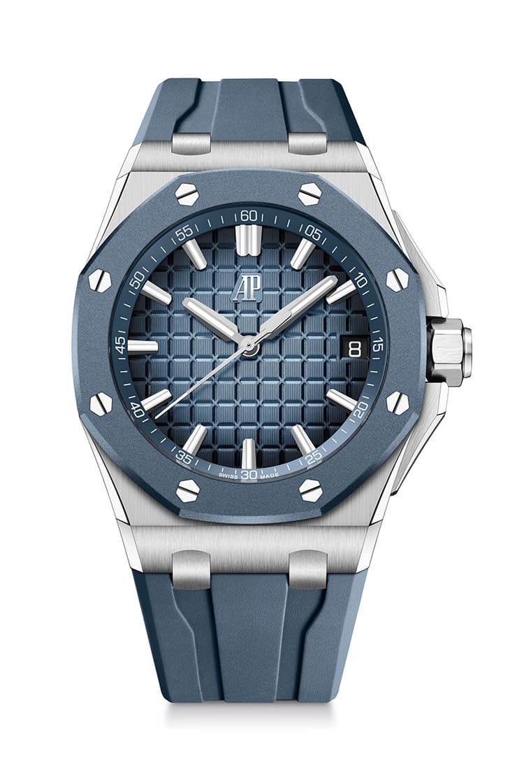 皇家橡树离岸型自动表以不锈钢材质制作,其43mm表径为系列主流规格,手表的蓝灰色表圈第一眼以为是陶瓷材质,但其实品牌在此用上的是橡胶覆层,反而表冠侧面没有再另外用橡胶包覆,至于手表的表带也是与表圈同色的橡胶材质,从不锈钢加上橡胶这样的组合可见爱彼AP还是遵循着系列加强版运动表的定位,致力于让手表可以耐操、实用,而且读时效果一清二楚。附带一提,品牌有略微调整过表冠护肩装置,大致上是把护肩高度降低、左右两侧线条拉长,让手表的线条更流畅简练。