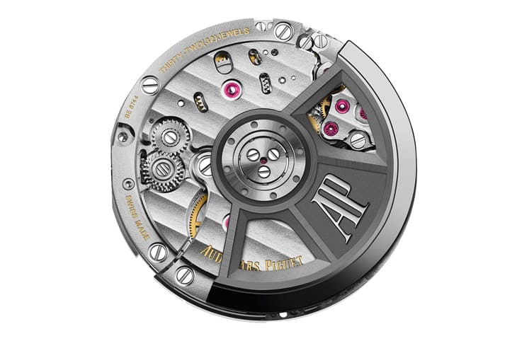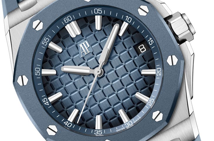 手表面盘一如系列多数作品具备"Méga Tapisserie"超大型格纹装饰,其与同属大三针的Royal Oak Offshore音乐限量版或Royal Oak Offshore潜水表格纹不尽相同,比较接近系列中的计时码表作品。而手表也延续表圈的顏色,以烟燻蓝色替格纹增添视觉吸引力。搭配镀銠指针与梯形时标,辅以面盘外围的蓝色刻度圈,佩戴者瞄一眼便能快速看懂时间,面盘3点方向与系列中的潜水表一样设有日期显示,由此提供基本却必要的各项时间资讯。