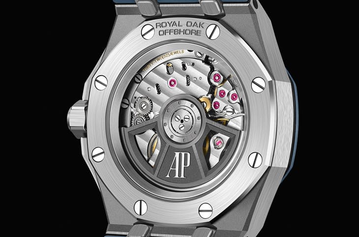 ▲表背的透明底盖设计无碍手表100米防水性能同时其具备爱彼AP近年积极引进的表带快拆系统。