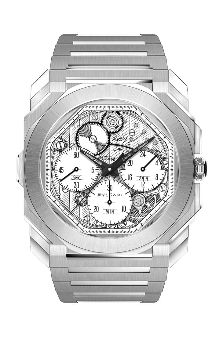 BVLGARI宝格丽的Octo Finissimo超薄表除了透过不同材质表现独立个性之外,近年品牌偶尔也会在面盘上做文章,例如最近宝格丽为了庆祝创立140周年,一口气发表三款Octo Finissimo新作,包含两款小三针以及一款计时码表,它们的共同点在于手表面盘跳脱常见设计而放上了机芯的素描图案,犹如把机芯倒置于面盘侧一样,可以看到微型自动盘、擒纵系统等重要机芯组件,而当一翻到表背,又能欣赏到实际的机芯结构,品牌以这种罕见的设计,向自身的悠久历史致敬。