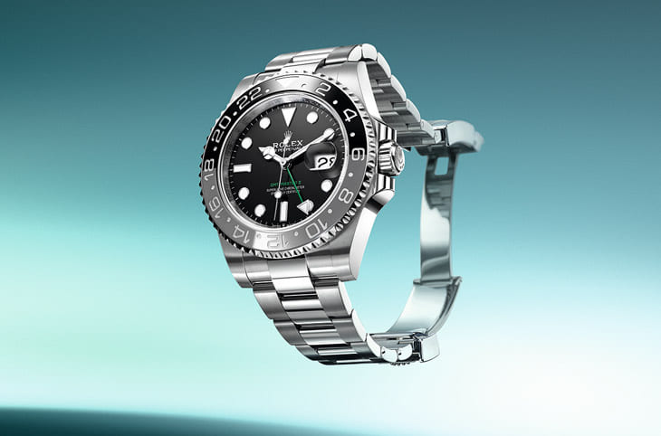 表展前传得沸沸扬扬的红蓝百事圈停产终究成了空响,不过劳力士倒是也有推出新款的不锈钢GMT-Master II,这次品牌延续2023年126713GRNR和126718GRNR採用的灰黑双色Cerachrom陶瓷表圈,搭配黑色漆面面盘,同时将自从116710停产以来仅使用在系列左冠表126720VTNR的绿色两地时间指针带回,同时面盘6点方向的"GMT-MASTER II"字样也回复为绿色,型号不难猜就地升级为126710GRNR,大家熟悉的绿针这次终于回来了,劳力士延续先前钢壳GMT-Master II的传统,同步释出三板带与五珠带款式供市场选择。