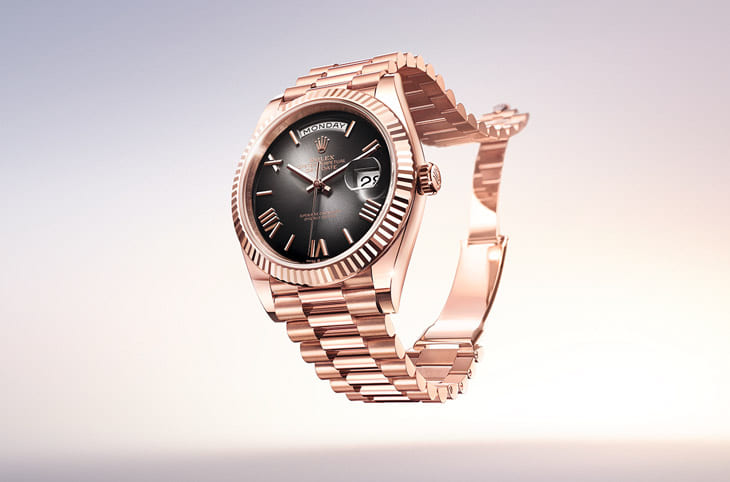 Day-Date系列2024年的新款重点也放在装饰工艺层面,因此劳力士新增了渐变色、珠光白色珍珠母或蓝绿色等面盘,加上罗马数字或几何造型时标,另外还有坑纹表圈或镶钻表圈等细节变化,衍生出相当大量的新作阵容。其中Day-Date 40部分有两款作品为品牌主打,一为永恒玫瑰金表壳搭配渐变石板灰色面盘,另一款为黄金表壳搭配珠光白色珍珠母贝面盘,后者还是总统表系列中首见的新设计,这种细节的小修小改对于Day-Date而言已是司空见惯,变化不大,但总是能让手表散发新意。