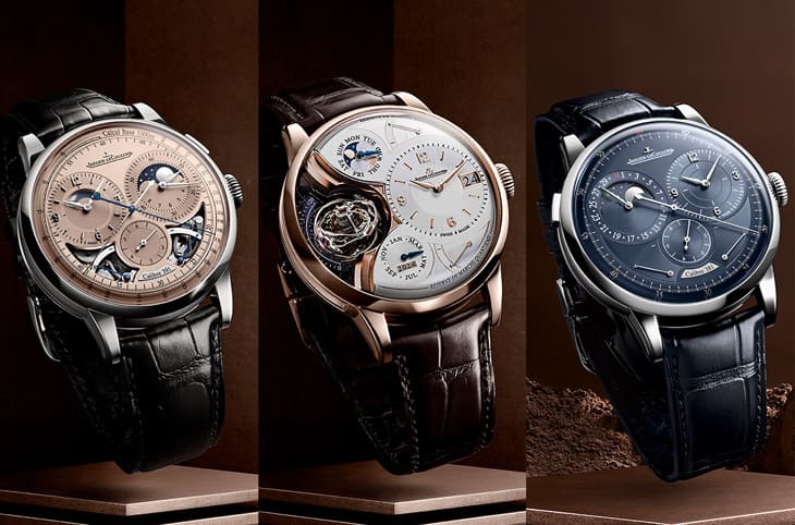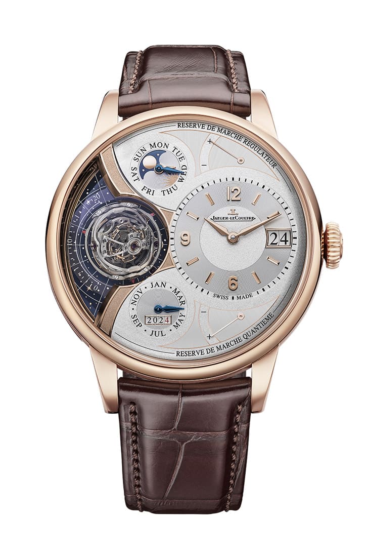 积家分别推出铂金表壳款与铜色面盘,以及玫瑰金表壳款配银色面等两款,它们都配备手工缝制鱷鱼皮表带,展现复杂正装表的优雅沉稳风格。品牌今年研发出391机芯,其为一款整合式机芯,融合手动上链单按把计时码表与月相显示、昼夜显示、双动力储存指示和跳秒显示等多重功能。面盘上机械机芯的细节透过两个镂空区域得以看出个概要,其採用独特的三计时盘布局,搭配修长指针,风格独特、一眼可辨。面盘表面和每个小表盘中央均採用质感细腻、近乎粉状的乳白润饰,而每个小表盘四周则会饰有「Azuré」图案(同心圆纹),小表盘略微凹陷,低于面盘,以此区隔不同区域的显示功能。月相显示与位于3点方向,小时、分钟计时盘呈同轴设计,突显整体布局的对称美感。一般走时时间包括12小时、60分钟和1/6秒,面盘下缘设有双发条盒和齿轮系的动力储存显示(各达50小时),两枚发条盒均由同一个表冠上链——佩戴者向前转动是计时功能发条盒上链、向后转动则替其他功能提供动力。