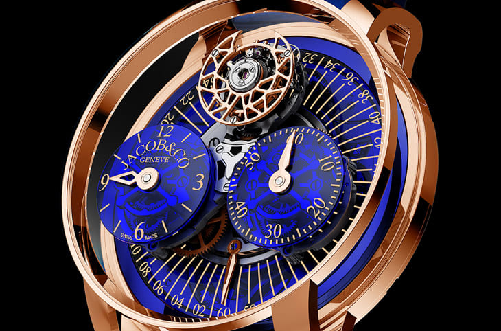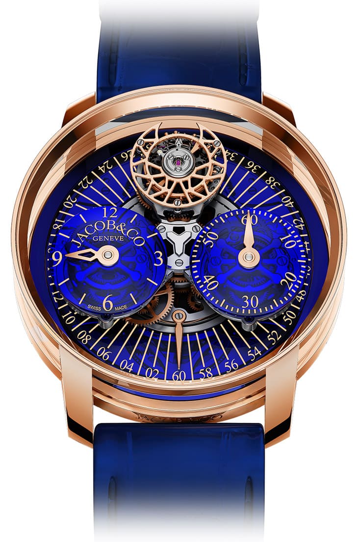手表採用43毫米表壳配置大尺寸蓝宝石水晶包括正、背面与左右、上下都有透明视野,为半透明蓝色圆拱形小表盘与大型的环形秒针盘提供了开阔视野。JACOB & Co.将最经典的复杂功能与其标志性Astronomia机械结构结合,大大颠覆了我们习惯的阅读方式,替手表带来与众不同的赏玩乐趣。