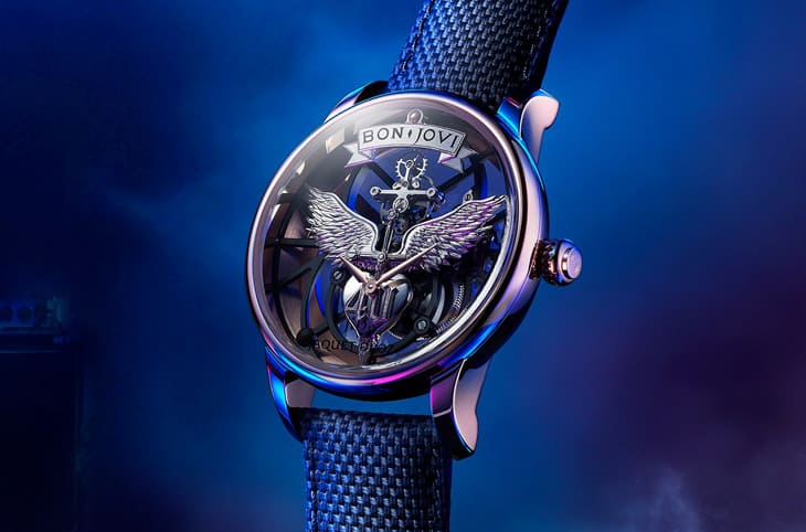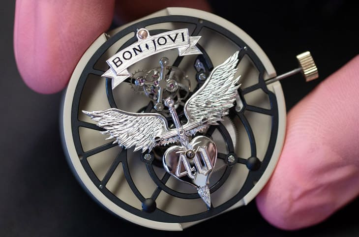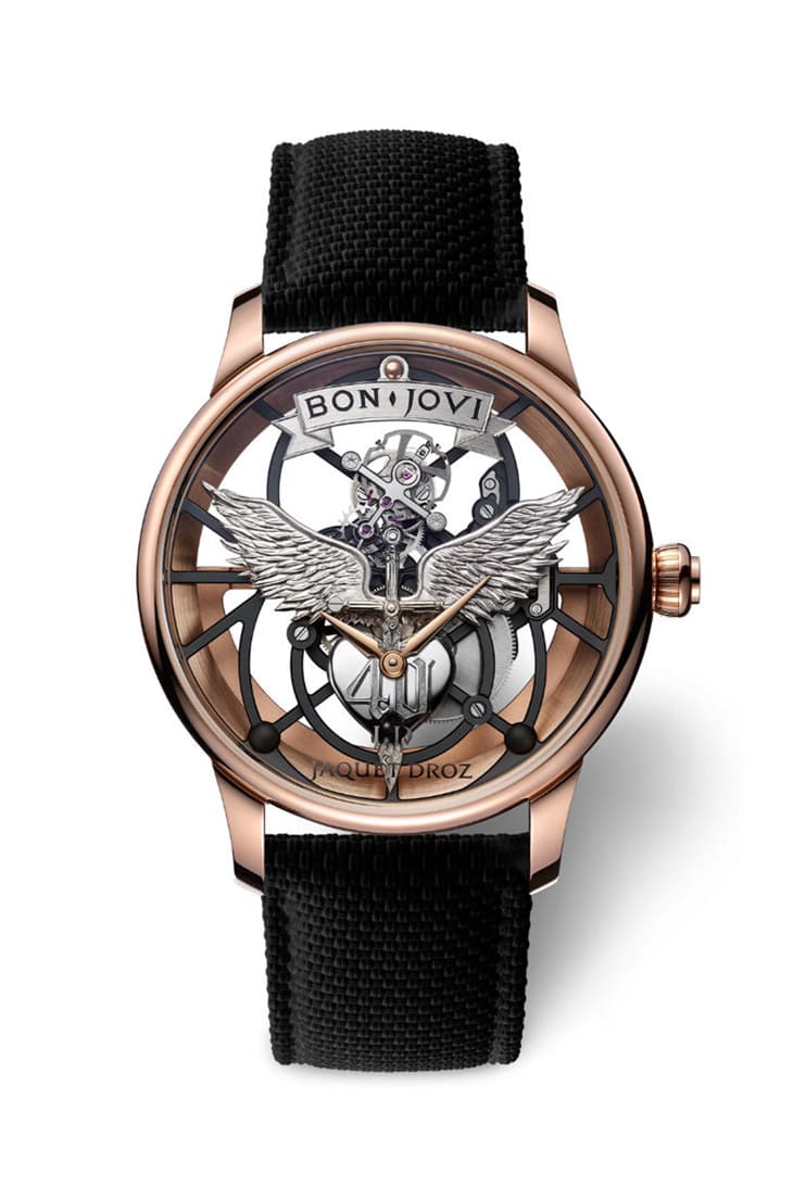 ▲适逢邦乔飞乐团成军40年,雅克德罗特别替乐团主唱Jon Bon Jovi量身打造一款专属于他的镂空陀飞轮手表。