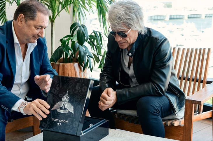 Jon Bon Jovi日前在他位于棕櫚海滩(Palm Beach)的住家与雅克德罗总裁Alain Delamuraz见面,后者亲自将这款独一无二的手表交到Jon Bon Jovi手上,从他拿到手表后兴奋的表情不难想见拥有这麼一款专属于自己的表有多嗨。据知邦乔飞主唱接下来会戴着这款表进行它们的40周年巡迴演唱会,到时陶醉在他们热力四射的经典歌曲之餘,也不妨多留意Jon Bon Jovi手上这款绝无仅有的「邦乔飞陀飞轮」。