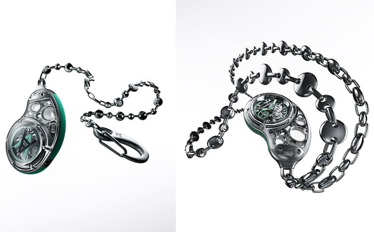 ▲除了放置在口袋,Arsham Droplet钛晶怀表也能加上项链掛在颈项间。