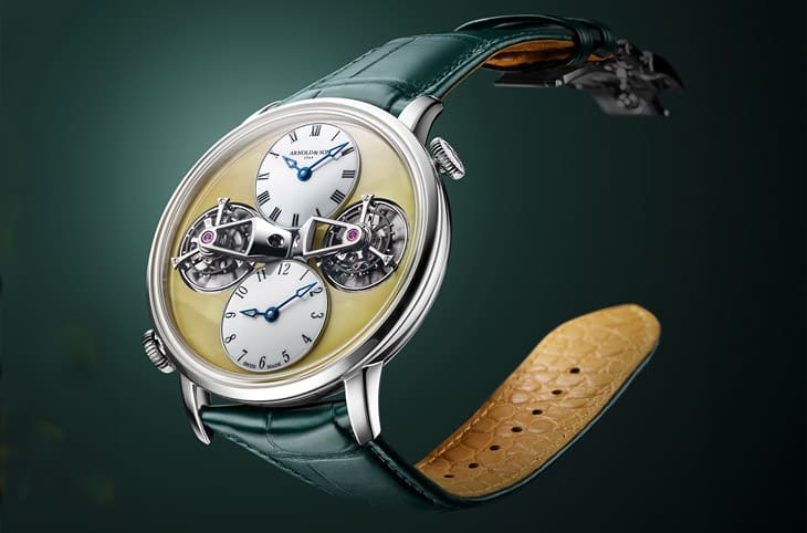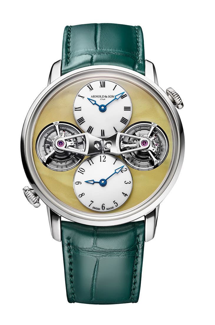 ARNOLD & SON新作Double Tourbillon White Gold展现出品牌两大工艺专长,包括珍稀面盘材质,以及高阶复杂功能等,这两大层面齐力让这款罕见的杰作散发出独树一帜的赏玩逸趣。