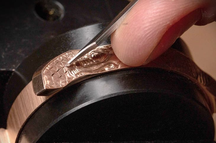 最后看到的又是另一款龙年生肖表,不过相较于L.U.C Quattro Spirit 25 Year of the Dragon还是属于纯粹的时、分显示功能,L.U.C Full Strike Year of the Dragon望名知意具备表表坛最顶级的自鸣功能,光是这种极致复杂的功能就已经让人叹为观止,何况萧邦还将生肖主题融入手表,不论是功能性或工艺层面,这款表都达到了S级般的超水准。萧邦将农历生肖图案的美学和自鸣报时功能巧妙融合,祥龙是中华文化的神话传说中备受尊敬的瑞兽,代表皇权、财富与繁盛,亦是吉祥的象徵。品牌于表侧、表圈、表耳和开面面盘均精心以手工鐫刻装饰图案,尤其面盘细致刻上了灵感源自汉朝玉珮、利用凹版雕刻技法呈现的祥龙图案,总计整只表的雕刻工艺费时超过500个工时,得来不易的珍贵性全都转化成视觉上的超卓魅力。表款搭载L.U.C 08.01-L机芯,它的一大特色在于配备蓝宝石水晶音簧,鸣响时能发出独有的清澈剔透音色,代表着萧邦尖端制表工艺的精髓,整只表的赏玩性也因此被推升到了极点。