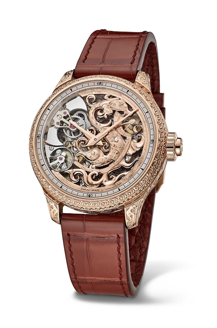 18K玫瑰金材质/L.U.C 08.01-L手动上链机芯/时、分显示/自鸣功能/三问功能/手工雕刻图案表壳/手工雕刻祥龙图案面盘/蓝宝石水晶镜面、透明底盖/表径42.5mm/限量1只