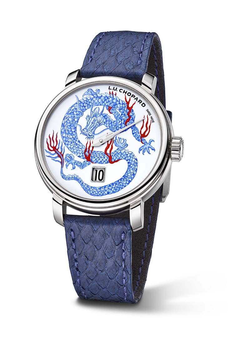 18K白金材质/L.U.C 98.06-L手动上链机芯/跳时、分显示/大明火珐琅祥龙图案面盘/蓝宝石水晶镜面、透明底盖/防水50米/表径40mm/限量8只/参考价:NT$ 2,646,000