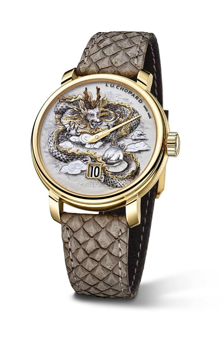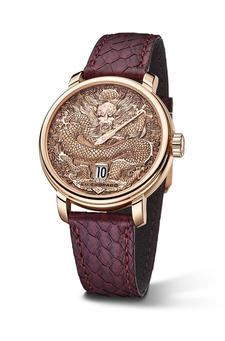 18K玫瑰金材质/L.U.C 98.06-L手动上链机芯/跳时、分显示/手工鐫刻祥龙图案面盘/蓝宝石水晶镜面、透明底盖/防水50米/表径40mm/限量8只/参考价:NT$ 3,347,000