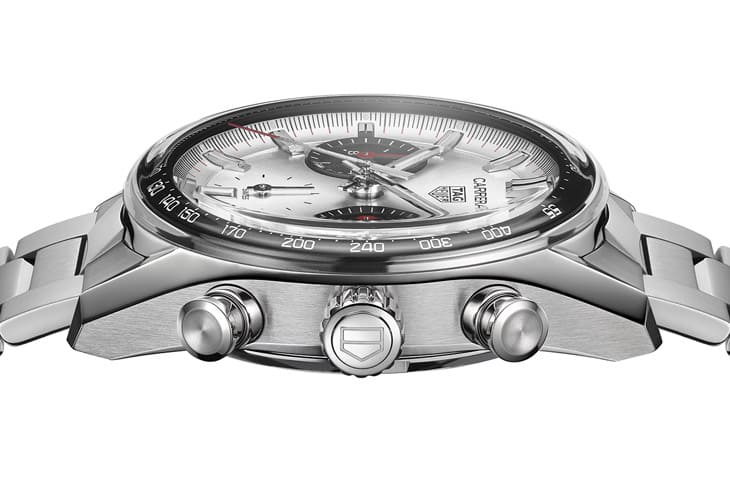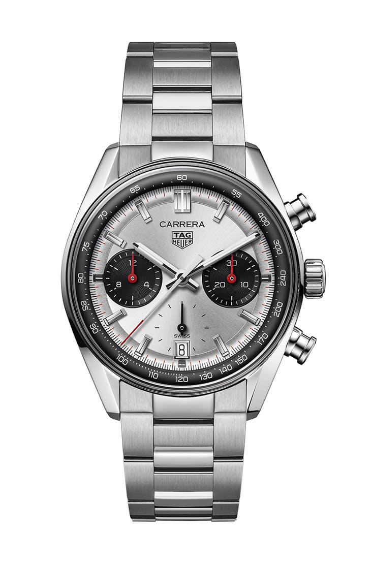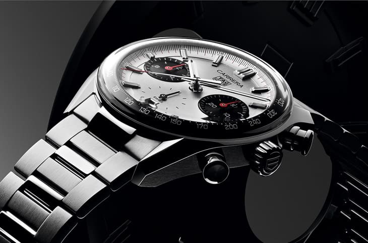 2024年的Carrera计时码表会让资深的品牌表迷想起1960年代大受欢迎的Heuer Carrera计时码表经典型号7753 SN;这款古董Carrera前几年因为好莱坞大明星麦特戴蒙于电影《赛道狂人》饰演汽车设计与制造商谢尔比(Carroll Shelby)时所佩戴再度掀起表迷一波回忆杀。7753 SN属于第二代Carrera计时码表,那年头的赛车表有个普遍特徵就是制表品牌惯常用银白色与黑色的组合形成银黑「熊猫面」或黑银「反熊猫面」的造型。7753 SN名称中的英文字母就分别代表着英文的「Silver银色」与法文的「Noir黑色」之意,这种对比感强烈的配色完美呼应泰格豪雅第四代传人Jack Heuer当年设计赛车表追求清晰易读的初衷,从那时开始带有熊猫面配色的赛车计时码表,遂成了专业车手以及表迷心中无可取代的理想赛车表雏形。