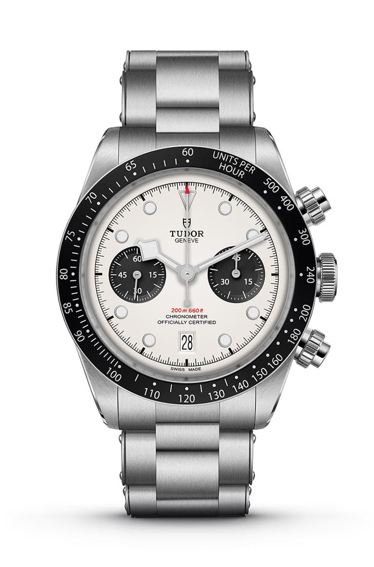 继前作的全黑面盘后,帝舵加码推出蛋白色面盘配黑色计时盘以及黑色面盘配银色计时盘等两种双色组合,大致来说前者归类于熊猫面,而后者自然就是反熊猫面。调整面盘顏色对品牌而言并不是大工程,甚至改配色本质上也有一点旧瓶装新酒的嫌疑,但是配色改得很合市场胃口,自然受到的关注不减反增。Black Bay系列之所以广受市场喜爱,与它的复古设计有关,这款同样拥有源自五○年代「大表冠」表款的上链表冠设计、富有辨识度的雪花指针,这些元素在功能更进阶的计时码表身上依旧不动如山;这款Black Bay Chrono的计时秒针针尖额外涂上红色,比起前作计时秒针清一色白色的设计,能帮助提升佩戴者阅读计时成果的清晰度,可以见得品牌持续思考如何让产品更理想的进取思维。