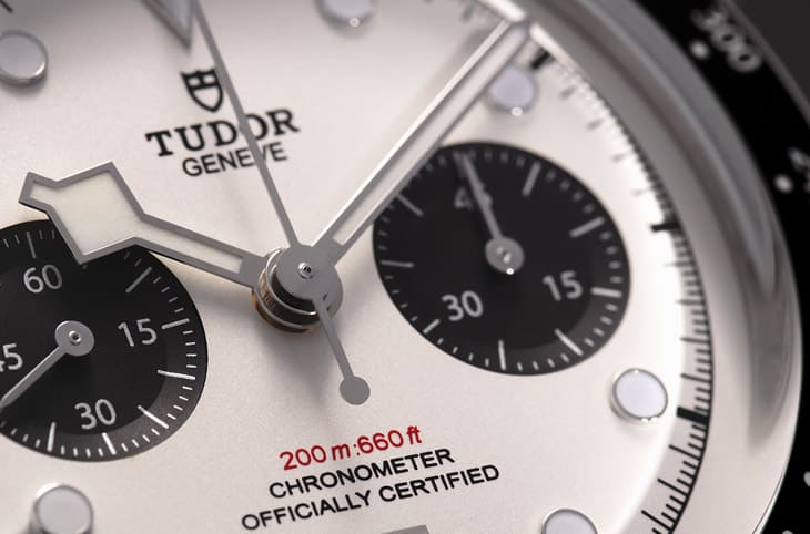 ▲Black Bay Chrono计时码表的面盘带点微微米色调,搭配黑色小表盘对比依旧强烈,同属熊猫面的一种。