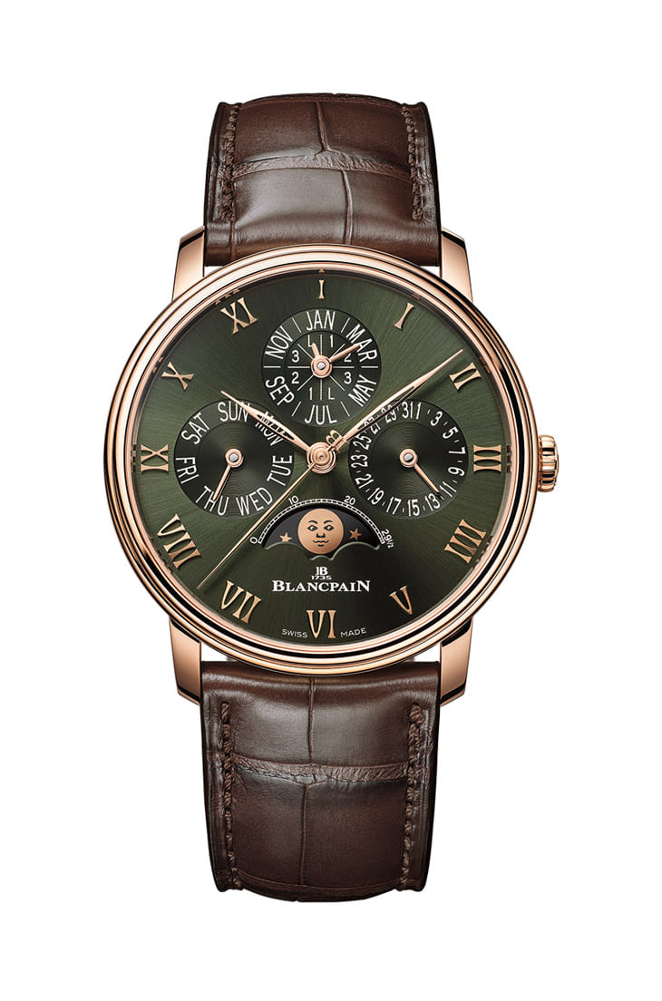 宝珀首次採用玫瑰金表壳搭配绿色太阳纹面盘,呼应汝拉山谷的冷杉林。面盘6点钟方向的人脸月相是品牌一大设计特徵,腕表还拥有宝珀专利表耳下方的隐藏式调校,可以维持表壳线条简洁俐落,佩戴者也不需要依靠工具徒手便能操作,相当便利。