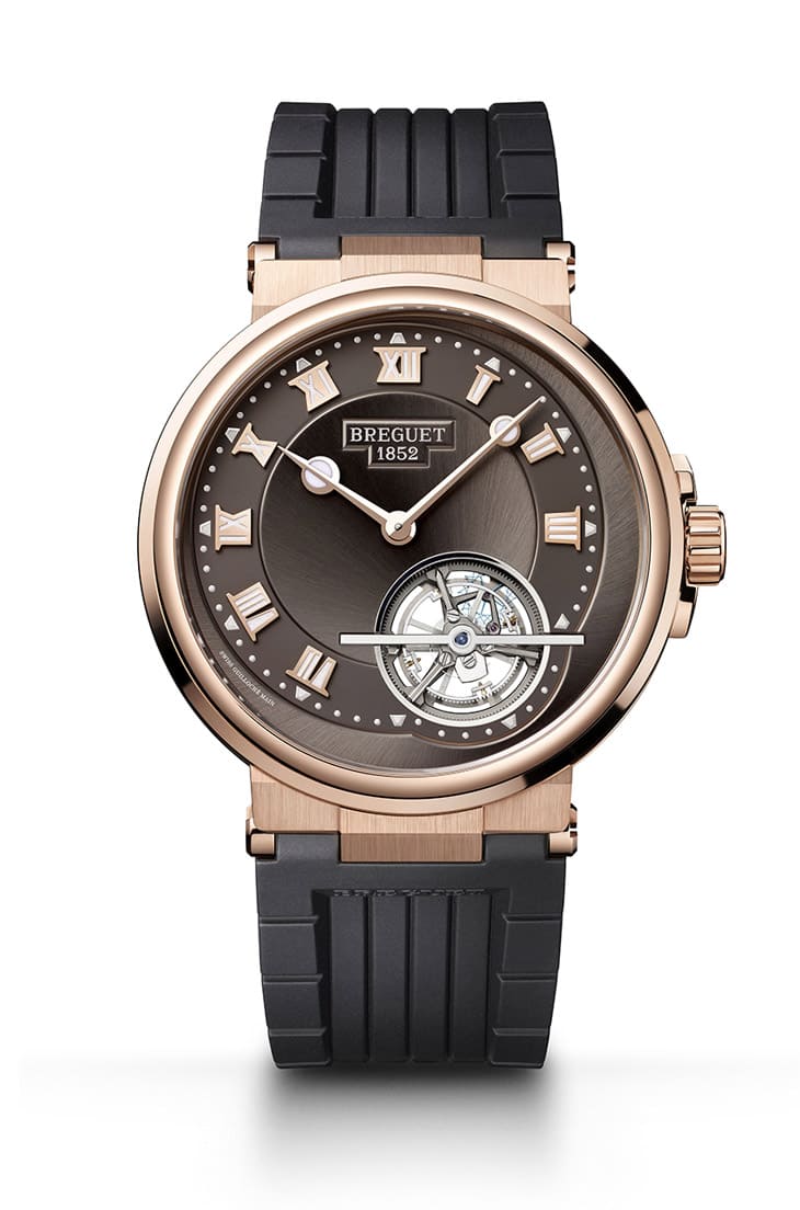 玫瑰金表壳搭配烟灰色面盘,陀飞轮框架位于5点方向,面盘採用微偏心设计,目的是让陀飞轮能成为焦点所在,另外宝璣也很注重手表的实用性,因为时标和镂空金质宝璣指针都覆有夜光涂层,强化阅读的清晰度。