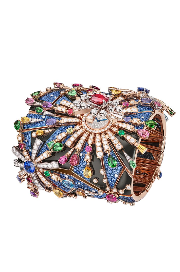 腕表以玫瑰金与蓝色钛金属半硬式表带彰显出天空色调,与深色縞玛瑙形成鲜明对比,品牌严格挑选各样繽纷宝石,塑造出烟火的夜空意象,这款表镶有超过60克拉的宝石,与总重约13.05克拉的钻石。