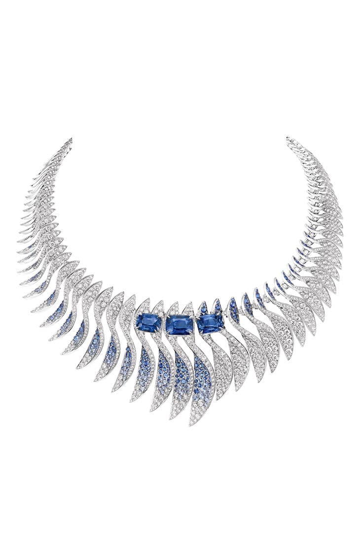 出自品牌全新顶级珠宝系列Chaumet en Scène,由蓝宝石与钻石镶缀而成的白金项链拥有可转换式冠冕,彷彿经过扭转挤压,又犹如高掛的杂技钢丝。项链镶嵌3颗各约重8.03、5.79及5.77克拉的枕形切割蓝宝石、圆形蓝宝石和明亮式切割钻石。