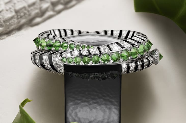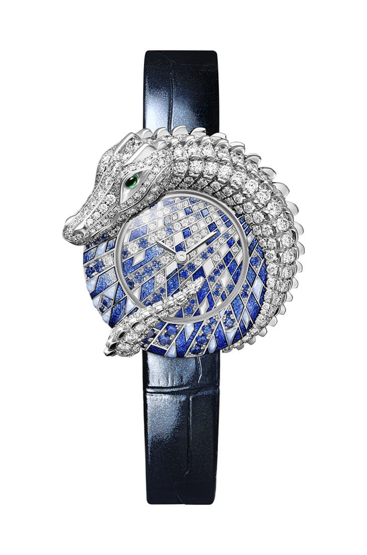 ▲Tigrée珠宝腕表使用镀銠白K金、玫瑰金、黄K金材质打造,鱷鱼以丰盈的椭圆形盘绕于菱形表盘,展现出蓄势待发姿态。手工真漆条纹形塑斑马元素。
