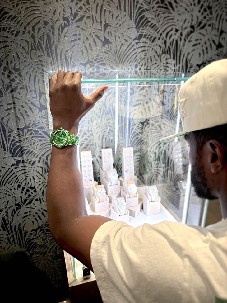 ▲入手新表后的梅威瑟某天戴了镶嵌沙弗莱石的绿色版本,似乎又正在寻找下一个准备入手的新收藏目标。