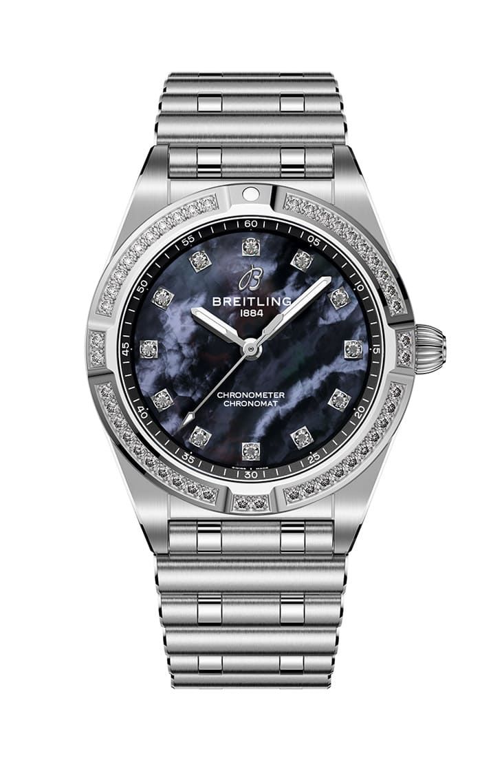 不锈钢材质/B72石英机芯/时、分、秒显示/黑色珍珠母贝面盘/表圈、时标镶钻/蓝宝石水晶镜面/防水100米/表径28mm/参考价:NT$ 197,000