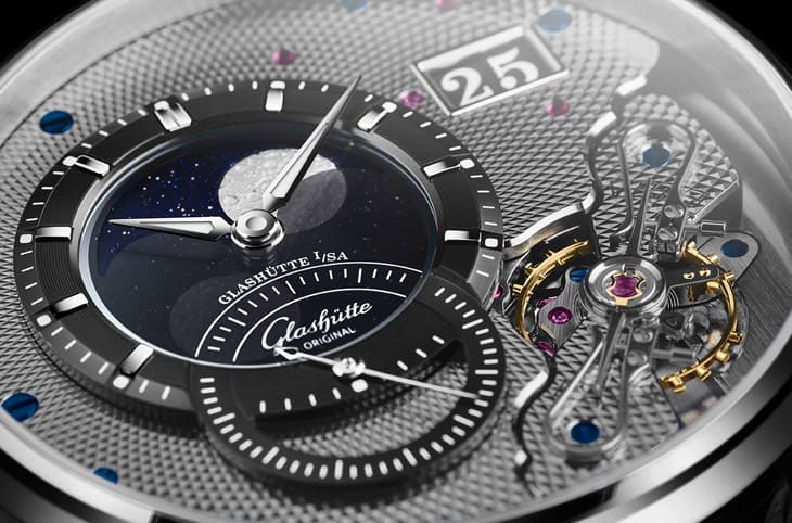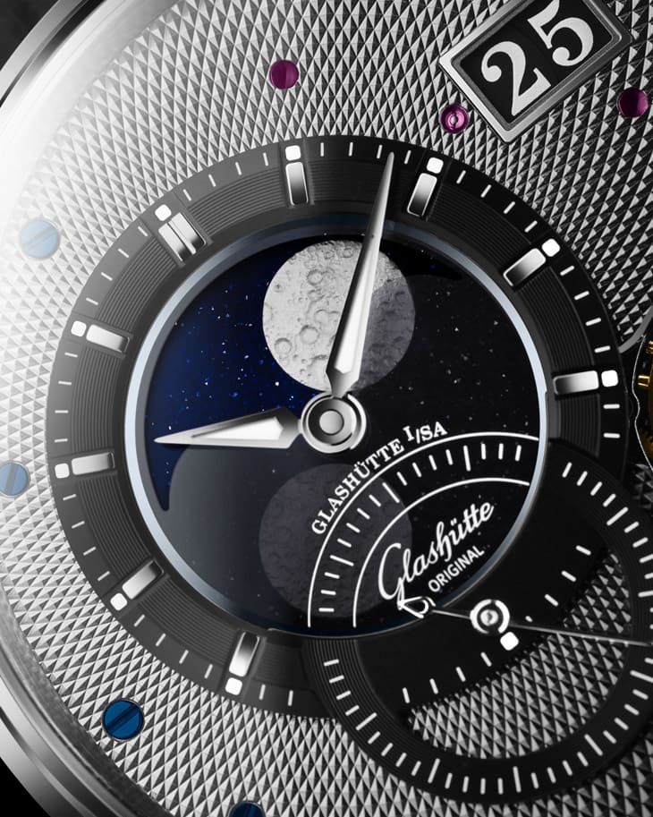 ▲大型月相整合进小表盘中,格拉苏蒂原创以砂金石制作月相盘,再以3D雷射雕刻技术刻出月球图案的起伏地貌。