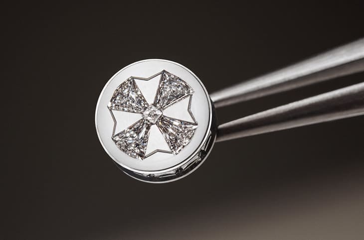 ▲表冠侧边和正面均铺镶隐形镶嵌钻石,其需经由特殊切割,以嵌入经拋光处理的马尔他十字标识4个分支之间。