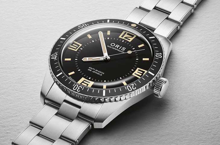 Divers Sixty-Five 60周年纪念表承袭Divers Sixty-Five系列的特色设计元素,并且引入了部分新设计细节,以更贴近原版的方式亮相。 手表的40mm不锈钢表壳与2015年那表款一致,不过它们都没有比照1965年的那只元祖作品——当时手表的表径仅36mm,因为以现代标准而言会稍感秀气一些,所以虽然力求还原古董表样貌,但是表径还是追随现代市场喜好,以适中的40mm之姿再度回归。手表的旋转表圈依旧是黑色铝圈,不过相较于2015年式在12点方向的夜光圆点外加倒三角形标记,新作回复到1965年原版的单纯夜光圆点设计,此外表圈上每5分钟刻度也做出微调,ORIS把原本的刻度的梯形改成平直的矩形,这是脱胎于1965年和2015年的新变革。