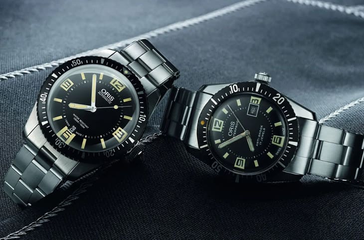 ▲ORIS 1965年开发出首款潜水表(右),2015年时值50周年时他们曾推出一款Divers Sixty-Five复刻表(左)以资纪念,2025年另有新款庆祝60周年里程碑。