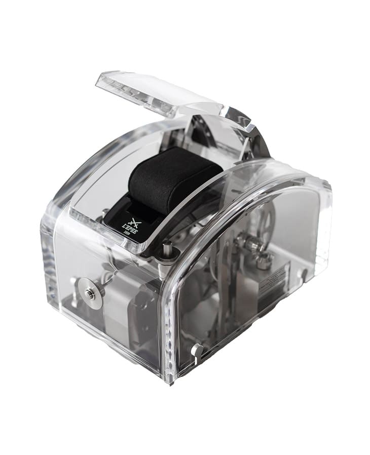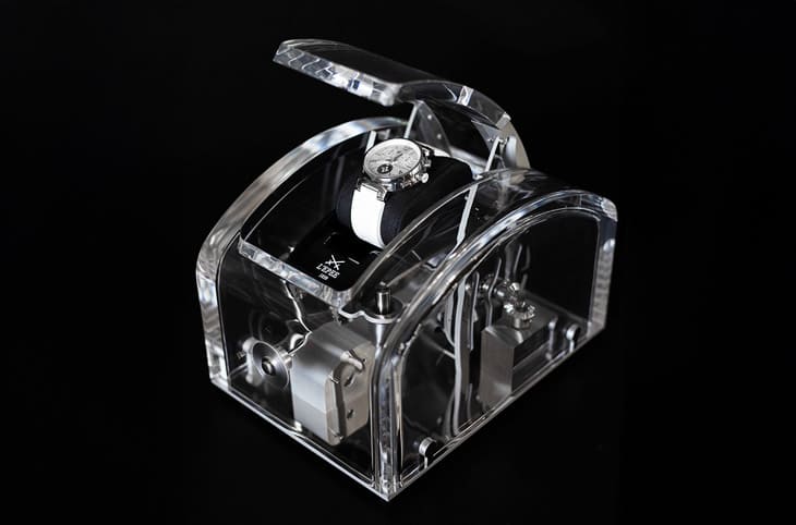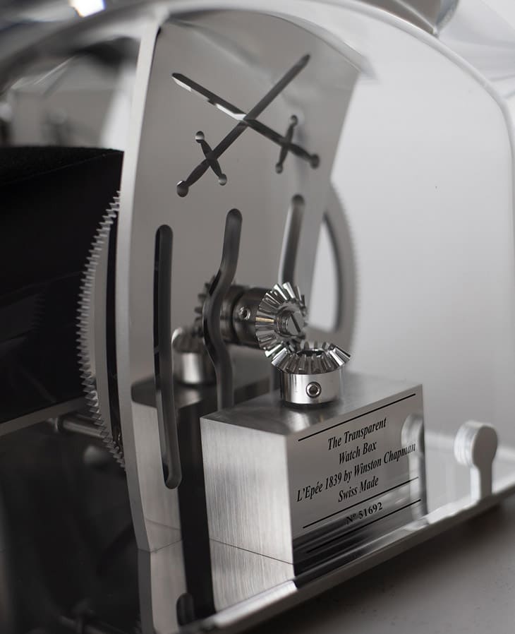 虽然架构和设计比起L’Épée的座钟相对精简,不过这款机械表展示盒内部的机械组件从开发到组装也全部都是他们独立完成,制作过程没有外观看起来容易。有趣的是,L’Épée开发出这款产品的背后功臣是一位来自美国的腕表收藏家兼设计师Winston Chapman,他在因缘际会下认识了L’Épée的执行长Arnaud Nicolas并且把他对于表盒的想法提出给Arnaud Nicolas,于是双方就从一个概念开始,直到催生出这款别致的机械表展示盒,因此在表盒内部右侧的机械组件中可见刻上这位提出最初想法的共同创作者姓名。