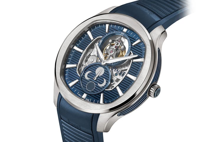 手表面盘与一般三针的Piaget Polo一样还是有水平饰纹,而也刚好又能对应到表侧新添的蓝色纹路,这也是Piaget Polo自从首度问世以来不可或缺的一大特徵,如今在Piaget Polo飞行陀飞轮月相表身上更被放大突显。这款表由于功能大跃进,因此12点方向和6点方向可见多了没有上层桥板遮蔽视线的陀飞轮装置以及简洁的指针式月相显示,其中后者的小表盘上还是有蓝色水平饰纹,维持整体一致的设计感。採用指针式设计还有个好处在于它少了层层叠叠的结构,月相显示的厚度因而能够压低至0.5mm,有助于促使机芯达到超薄境界。别看月相显示呈现出一派轻松写意的样子,它的构造还是相对精密,也因此每经过122年才会累积一天的误差需要调校,显示时间的准确性与陀飞轮的存在有着相辅相成的效用。
