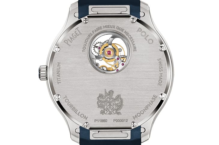 Piaget Polo飞行陀飞轮月相表背面的钛金属底盖上也替陀飞轮装置开有小窗口,让人可以完整透视陀飞轮装置的运作动态,虽然手表内部的642P机芯因此无法尽窥更完整的样貌,但熟悉PIAGET手表的人,一旦知道它是传承600P陀飞轮机芯的血统便能感受到机芯的优异工艺水准,这枚机芯厚度仅4mm,摆轮震频为稳定的3Hz,动力储存44小时相对美中不足,但在表主养成定时上链习惯后也不会对佩戴造成明显不便。