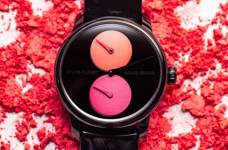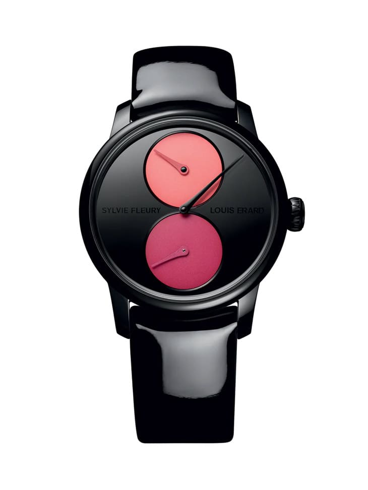 ▲LOUIS ERARD携手艺术家Sylvie Fleury,后者以彩妆盒为灵感,重新诠释令表迷熟悉的Le Régulateur三针一线手表。