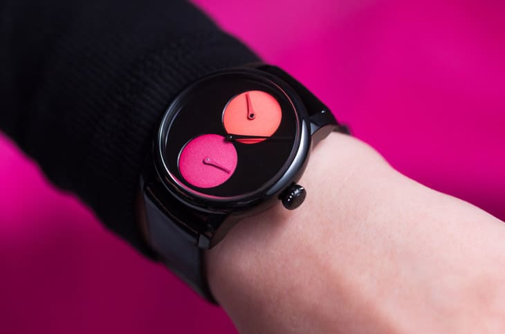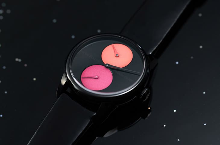 表款以黑色PVD不锈钢制作,搭配亮面黑色皮革表带替手表奠定基调。彩妆盒一般都是黑色外观,烘托出裡面眼影、腮红与粉饼的色彩,这也是Le Régulateur x Sylvie Fleury彩妆盒联名表予人有强烈既视感的第一眼印象,其面盘同样是黑色,不过12点方向的圆形小时盘和6点钟位置的圆形小秒盘分别为珊瑚色和桃红色,它们都带有雾面微凸效果,就像彩妆般散发吸睛色彩,两枚小表盘都搭配与各自同色调的指针,除此之外小表盘不另设时标或刻度,散发独树一帜的艺术风格。