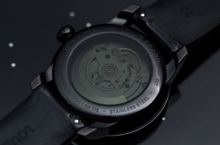 ▲黑色透明底盖可以欣赏手表内部的Sellita通用机芯,而手表的限量编号也鐫刻在底盖边缘,突显联名稀有性。