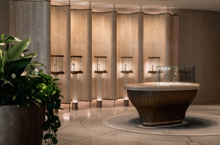 ▲走进位于香港The Henderson大楼的AP House,首先会注意到圆形手表展厅及其附近的波浪形洞石大墙展柜。